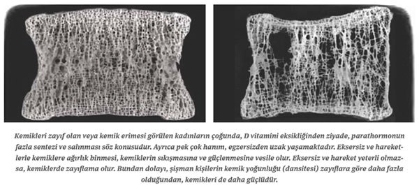 Zaman zaman kemik erimesi teşhisi konulan bazı hanım hastalar, doktorların kendilerine; “Eğer vücuduna yeterince güneş ışını almış olsaydın, örtülü olmasaydın, kemik erimesi olmazdın.” dediklerini ve bunun ne derece doğru olduğunu soruyor. Bunun bir hakikati var mıdır? Yoksa bu, ideolojik tabanlı bir teşhis midir? Konuyu ilmî veriler ışığında incelersek, kemikleri zayıf olan veya kemik erimesi görülen kadınların çoğunda, D vitamini eksikliğinden ziyade, parathormonun fazla sentezi ve salınması söz konusudur. Ayrıca pek çok hanım, egzersizden uzak yaşamaktadır. Egzersiz ve hareketlerle kemiklere ağırlık binmesi, kemiklerin sıkışmasına ve güçlenmesine vesile olur. Egzersiz ve hareket yeterli olmazsa, kemiklerde zayıflama olur. Bundan dolayı, şişman kişilerin kemik yoğunluğu (dansitesi) zayıflara göre daha fazla olduğundan, kemikleri de daha güçlüdür.